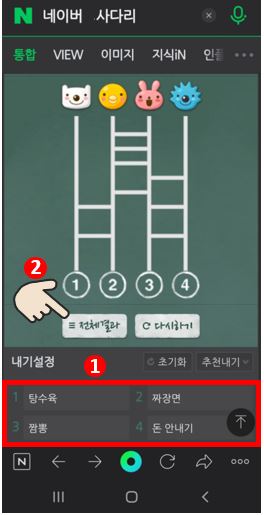 스마트폰에서도 똑같은데요. 이름을 직접 적을 필요는 없습니다. 인원수만 정하면 알아서 캐릭터가 생깁니다. 원하는 캐릭터를 각자에 맞게 정합니다. 다음 내기 설정은 직접 적어주고 '전체 결과'를 눌러주면 사다리 게임의 결과가 나타납니다.