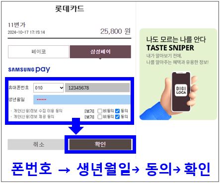 다음 화면에 폰번호 입력 → 생년월일 입력 → 동의 확인 → 확인 선택. 그리고 폰으로 삼성페이 결제