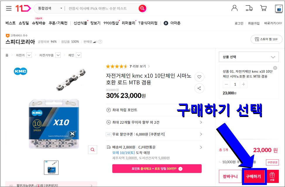 11번가에서 결제할 상품을 결정하고, 오른쪽에 보이는 '구매하기'를 선택합니다.