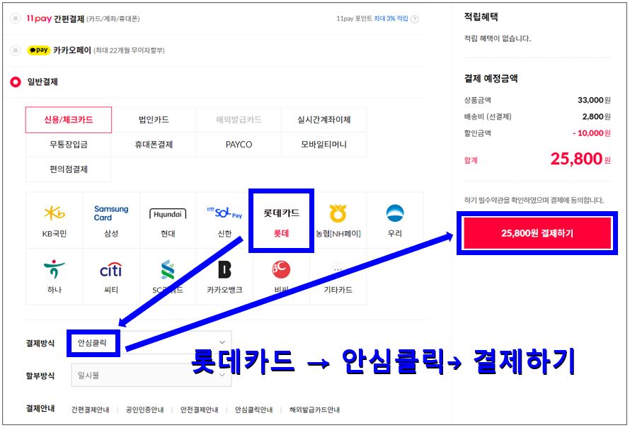 순서대로 롯데카드 선택 → 안심클릭 선택 → 결제하기 선택