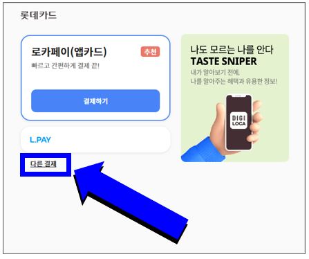 롯데카드 창이 뜨면 '다른결제' 선택 후 '삼성페이' 선택합니다.