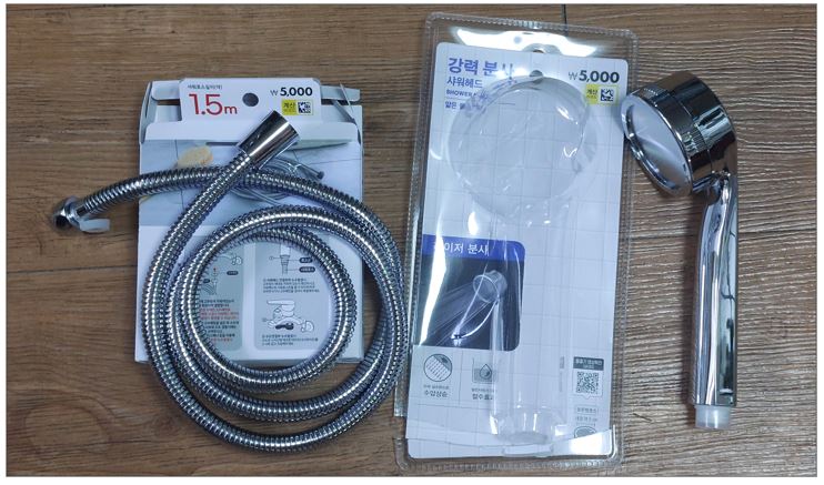 다이소에서 사온 1.5m 샤워호수와 강력분사 샤워기입니다. 각 5천원씩 총 만원입니다.