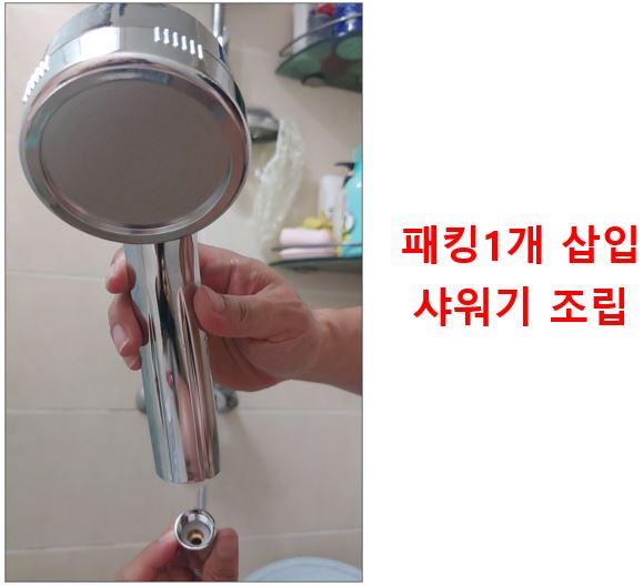 이제 호수 다른 끝부분에 나머지 패킹을 넣고 샤워기를 조립해 줍니다.