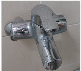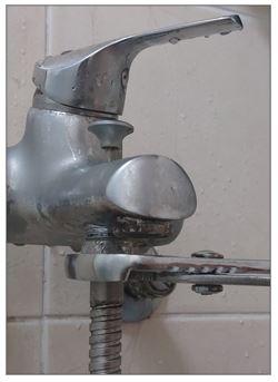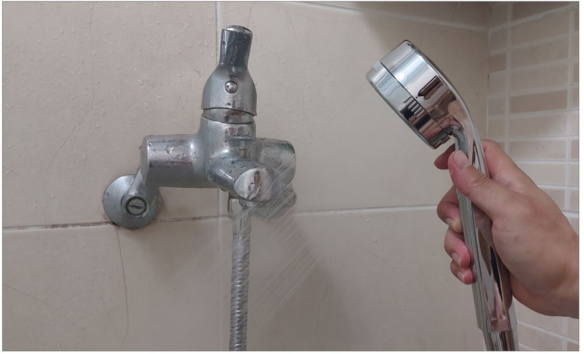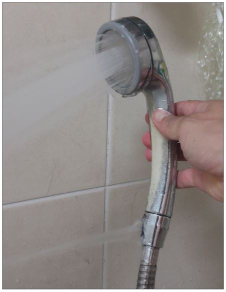 화장실 문제의 샤워기 입니다. 손잡이 아래 부분이 깨져서 물이 새어나오고 있습니다. 얼릉 교체해야합니다.