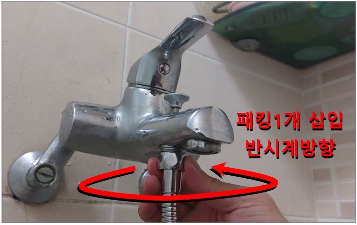 고무패킹 하나를 호수 끝에 넣고 반시계방향으로 잠굽니다. 이때는 굳이 렌치를 이용할 필요가 없습니다. 손으로 힘껏 돌려만 주면 됩니다.