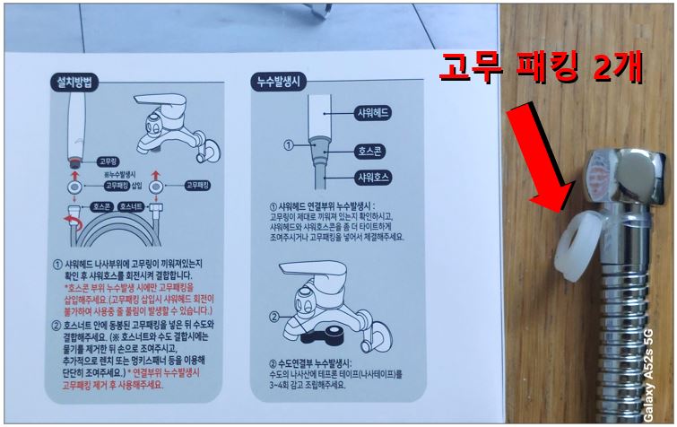 샤워호수 끝부분에 고무 패킹 2개가 달려있습니다. 양 끝에 하나씩 끼워주면됩니다.