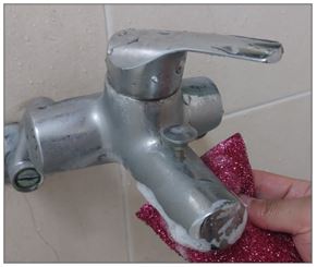 호수를 떼어내고 더러워진 꼭지를 치약으로 깨끗하게 닦은 후 씻어줍니다(치약을 묻여서 수세미로 박박 닦아주면 됩니다).