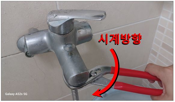 기존 샤워호수 볼트에 렌치를 끼우고 시계방향으로 돌려줍니다. 금방 풀립니다.