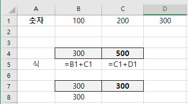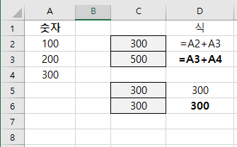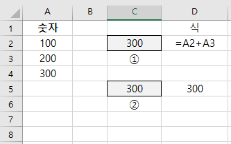 A열에 숫자 100, 200, 300이 있습니다. 'C2' 셀에는 수식 '=A2+A3'이 입력되어 300이 계산되어 있습니다. 서식으로는 셀테두리와 음영도 들어가 있습니다. 'C5'셀은 똑같은 서식에 숫자 300이 입력되어 있습니다.