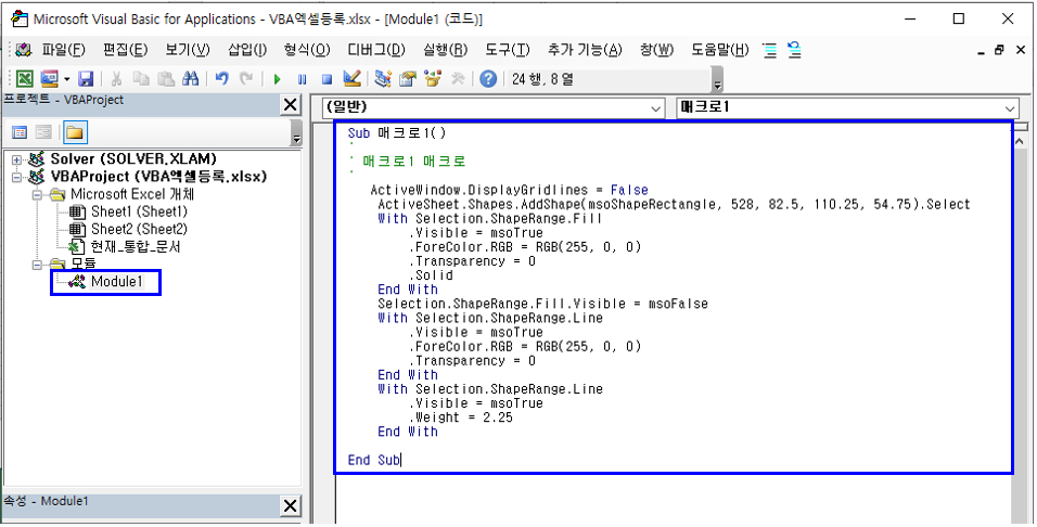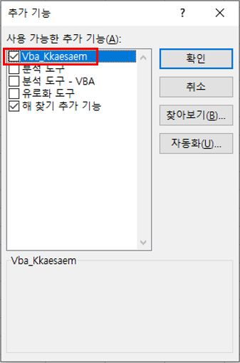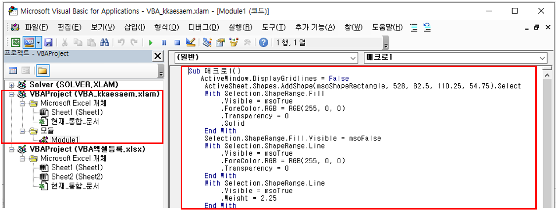 VBA와 코드가 보여지네요. 제대로 등록되었습니다.