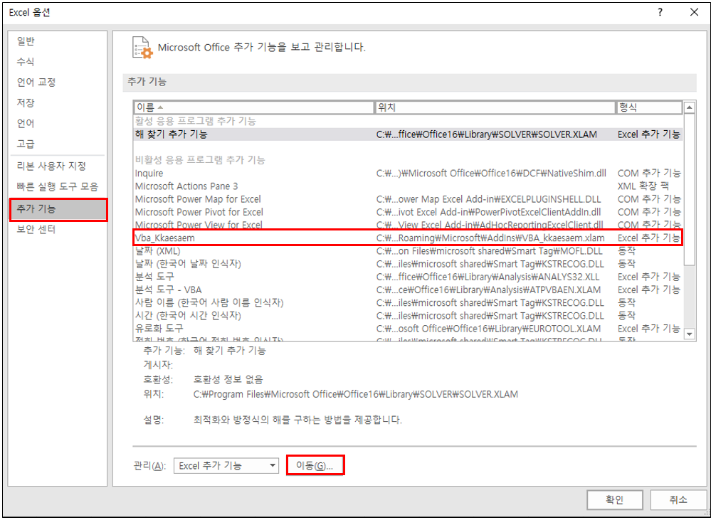 추가기능을 클릭하면 저장된 xlam이 보입니다. 그리고 하단에 "이동"을 눌러줍니다.
