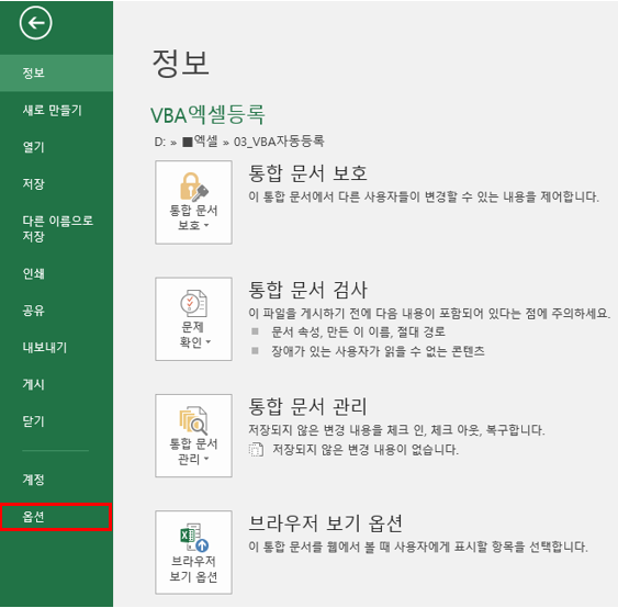 xlam 파일이 만들어 졌으니 자동등록을 하면 됩니다. 파일에서 옵션을 선택합니다.