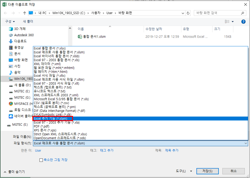파일형식 칸에서 클릭을 해주면 Excel 추가기능(*.xlam)을 선택합니다.