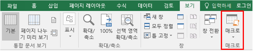 먼저 VBA 코드를 만들어 보겠습니다. "보기-매크로"에 들어갑니다.