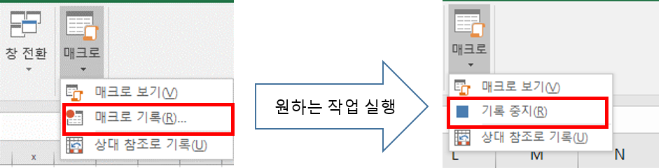 '매크로 기록'을 누르고 원하는 작업을 실행하고 다시 매크로에서 '기록 중지' .