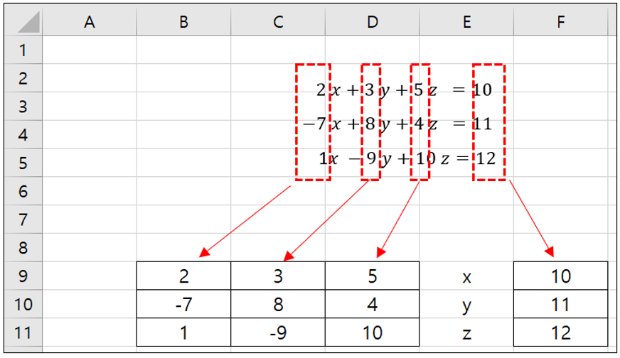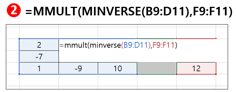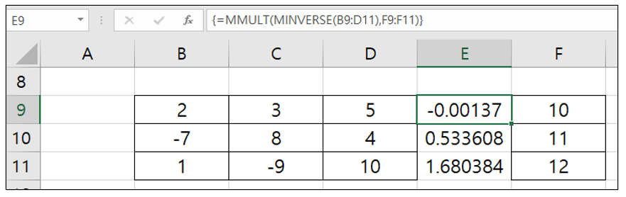 E9셀에서 '=MMULT(MINVERSE(B9:D11),F9:F11)'를 타이핑한 후,