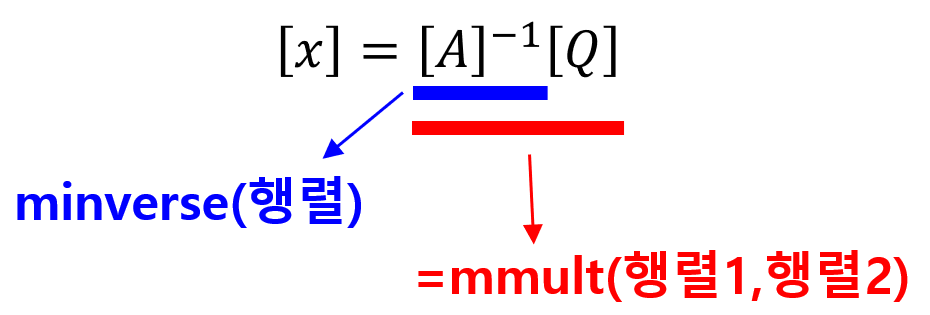 엑셀에서 역행렬을 구하는 함수는 minverse(행렬) 이고 행렬 간 곱은 mmult(행렬 1, 행렬 2)입니다.