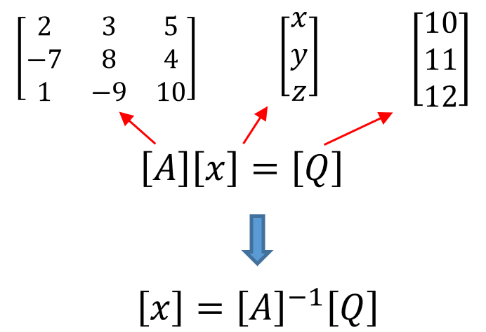 위 식을 풀기위해 다음과 같이 행렬 식을 세울 수 있습니다. 좌변 [A] 행렬은 미지수 앞에 있는 숫자 행렬입니다. 우변 [Q] 행렬은 결과 값입니다. 미지수 행렬[x]은 [A] 역행렬과 [Q]행렬을 곱해서 구하면 됩니다.