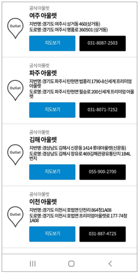 보이는 메뉴에서 '아울렛'을 선택하면 상설할인매장을 확인할 수 있습니다.